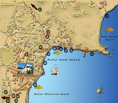 Michalis Apartments is located at Aliki in a very good position of the village, with walking distances from anything you need, just 50 from the sea, 150m from Aliki main beach and 150m of St. Nikolaos beach, 30m from the bus station, 100m from kiosk, childrens playground, football and basket courts, 50m from restaurant, 100m from super market, 200m from Aliki center with everything you need, snack-bars, pizzas, cake-shops, souvenir shops and tavernas on the sea. At Makria Myti (about 1 km.) you'll find small desert beaches unique for swimming and underwater fishing.